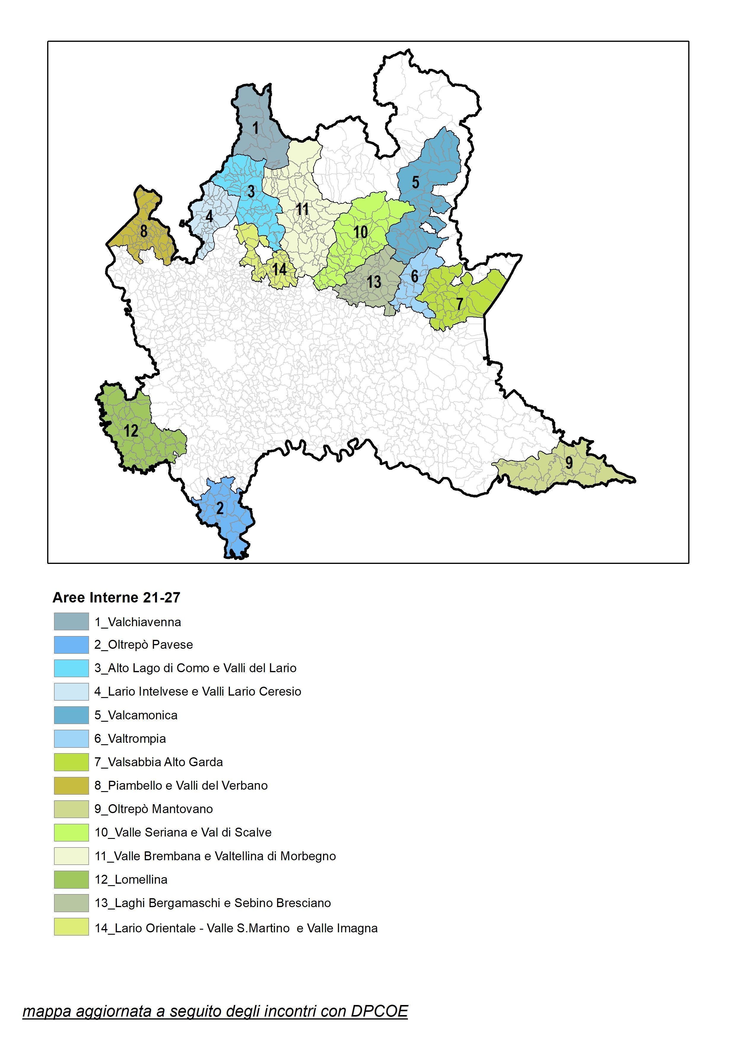 Al termine del confronto con il Dipartimento Politiche di Coesione è stato possibile ampliare la cornice geografica identificando 14 Aree Interne selezionate nell’ambito della Strategia Regionale “Agenda del Controesodo” di seguito indicate: 1. Valchiavenna; 2. Oltrepò Pavese; 3. Alto Lago di Como e Valli del Lario; 4. Lario Intelvese e Valli Lario Ceresio; 5. Valcamonica; 6. Valtrompia; 7. Valsabbia Alto Garda; 8. Piambello e Valli del Verbano; 9. Oltrepò Mantovano; 10. Valle Seriana e Val di Scalve; 11. Valle Brembana e Valtellina di Morbegno; 12. Lomellina; 13. Laghi Bergamaschi e Sebino Bresciano; 14. Lario Orientale – Valle S. Martino e Valle Imagna.